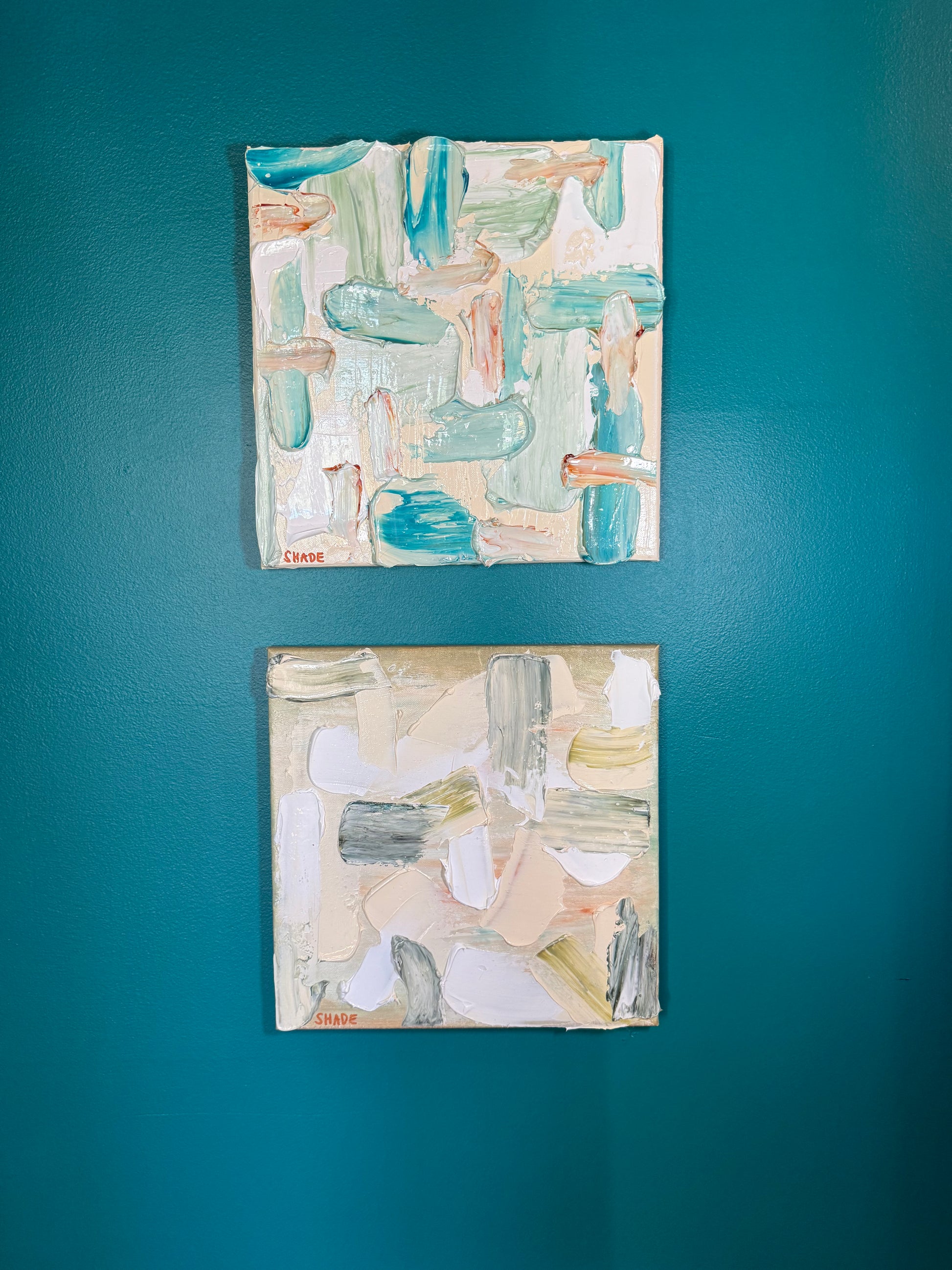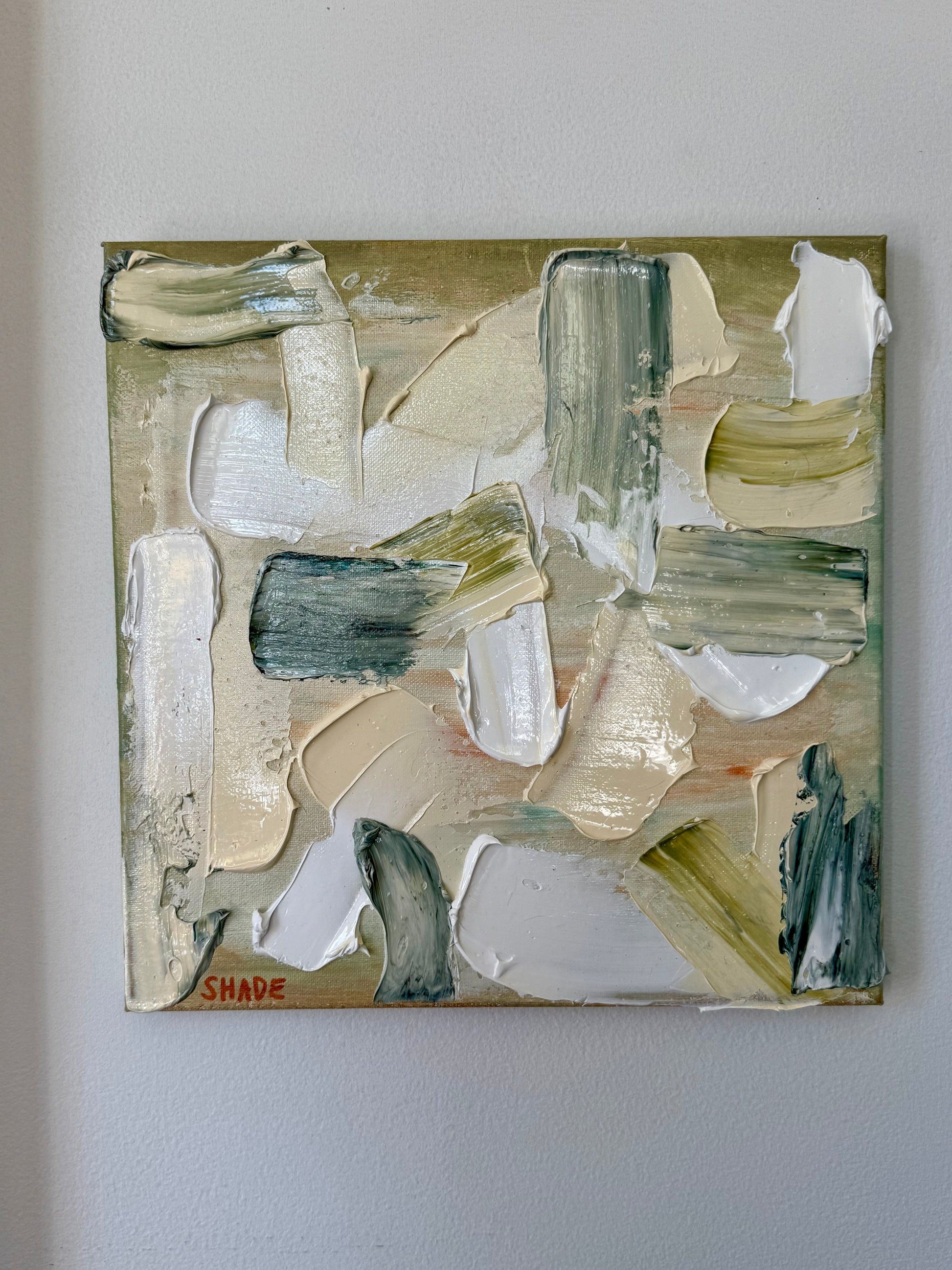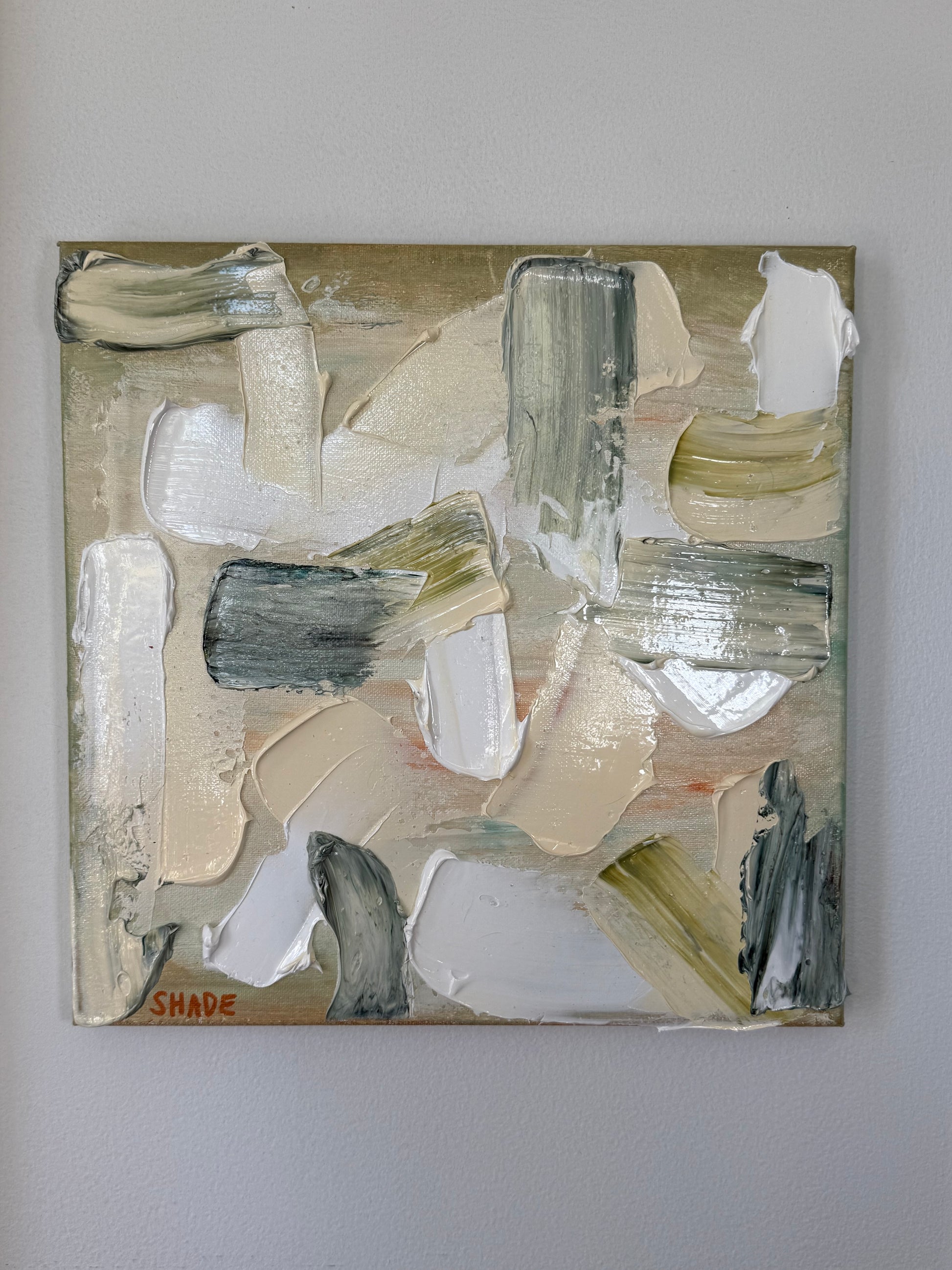 A 12x12 abstract layered with soft neutrals, sage, and ivory. Thick palette-knife strokes create depth and subtle movement, offering a calming yet dynamic presence.